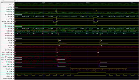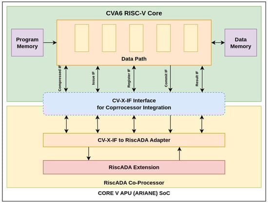 The RiscADA extension was integrated as a coprocessor into the Ariane SoC (Figure 4) beside CVA6 [] (CV64A6-IMAFD—RV64IMAFD) using the CV-X-IF interface [], a specialized interface for connecting co-processors to the main core. For the purpose of integration, the authors designed a CV-X-IF adapter, which implements an FSM for performing the handshaking between the RiscADA extension and the signals of the coprocessor interface. The RiscADA extension files added by the authors to the CVA6 repository fork available at https://github.com/cosminandreipopovici/cva6/tree/kcu116 (accessed on 1 July 2025) are organized in the directories at the following paths: