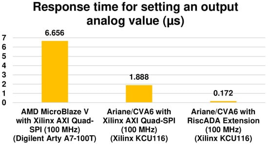 Since the most common way of controlling high numbers of external DACs and ADCs in analog acquisition and control systems is using FPGAs with soft-cores or custom designs, the authors made a resource utilization comparison between using MicroBlaze V with Xilinx AXI Quad-SPI Peripherals and using CVA6 with RiscADA extension for different numbers of external converters. The synthesis and implementation were performed for a Xilinx XC7A100TCSG-1 FPGA.