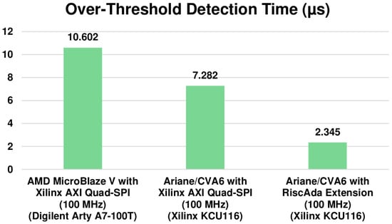 The proposed solution achieves 5.35× and 3.05× times higher sample rates of reading external ADC measurements than the two configurations enumerated above. By performing digital signal conditioning, RiscADA extension detects an over-threshold signal 4.52× and 3.1× times faster than MicroBlaze V and the CVA6 core controlling the converters with Xilinx AXI Quad-SPI peripherals. The RiscADA extension is scalable, being able to control up to 64 external DACs and up to 64 external ADCs.