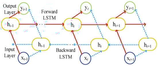 After collecting data, such as the EV’s entry and exit times, the SOC at the time of entry, the historical data can be divided into a training group and a test group. Firstly, the data of the training group are utilized to discover the intrinsic connection; secondly, the data of the test group are utilized to verify the accuracy. Compared with the traditional LSTM, Bi-LSTM adds the inverse LSTM process, which can better liaise the historical data with the future data. Details can be found in the literature [,,,]. The predicted historical data are used as the charging and discharging ranges and SOC variation ranges of the EV cluster shared energy-storage characteristics in the real-time phase, and Figure 2 shows the schematic diagram of the Bi-LSTM method.