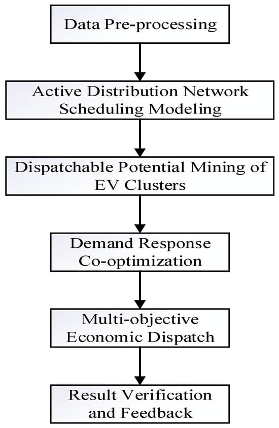 The participation of the DR and EV in ADN economic scheduling has been explored in the literature. Literature [] dissected the correlation between DG access nodes and studied the optimal scheduling of users considering DR. Literature [] proposed an optimization model containing EV regulation and a DR potential assessment, which solved the ADN overload problem. Literature [] proposed an EV model under willingness-based dynamic adjustment of the DR, which effectively smoothed the fluctuation of new energy unit output in the ADN. Literature [] investigated a distributed photovoltaic and EV access to the distribution network model, which effectively reduced the load volatility of the ADN. Literature [] introduced the DR and solved it using the target cascade method, which effectively reduced the operating cost of the ADN. Literature [] investigated the impact of EV integration on the system and the optimization method of the distribution network. However, the aforementioned literature has only taken into account the charging and discharging effects of individual EVs. Individual EVs are prone to large errors due to the uncertainty of the charging and discharging time and the state of charge (SOC) when they arrive at the charging station, which in turn affects the optimal scheduling process of the ADN.