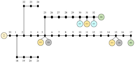 In this paper, the above models are tested and analyzed using the improved IEEE-33 bus test system, which contains the node wiring diagrams of the OLTC, SVC, and EV cluster shared energy-storage device, as shown in Figure 4. Among them, the specific parameters of the OLTC and SVC models are shown in the literature []; the EV cluster shared energy-storage model is shown in the literature [].