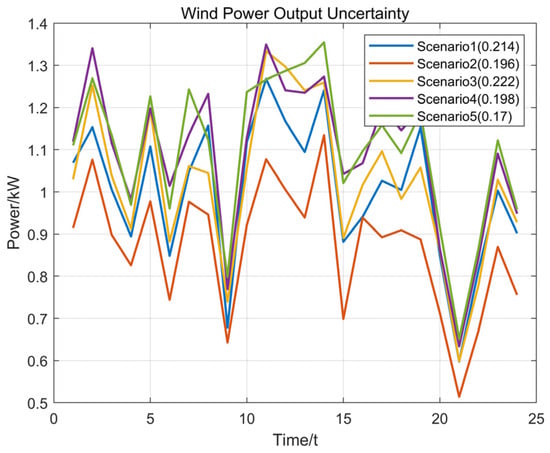 The data generated from the scenarios of wind turbine and PV are first processed. The DG output probability density curve obtained according to the Frank Copula function is shown in Figure 5 and Figure 6, according to the probability density function method of the DG scene generation after the 500 wind and solar complementary scenes and the generation of wind power and photovoltaic power generation scenarios for the reduction. Figure 5 depicts wind power scenarios: Scenario 1 (0% reduction, ideal output), Scenario 2 (10% reduction), Scenario 3 (20% reduction), Scenario 4 (30% reduction), and Scenario 5 (40% reduction). Figure 6 shows photovoltaic scenarios: Scenario 1 (0% reduction), Scenario 2 (10% reduction during partial periods), Scenario 3 (20% reduction full period), Scenario 4 (30% reduction peak hours), and Scenario 5 (40% reduction). In addition, to calculate the probability of each scenario, the power output power is expressed based on the youngest value.