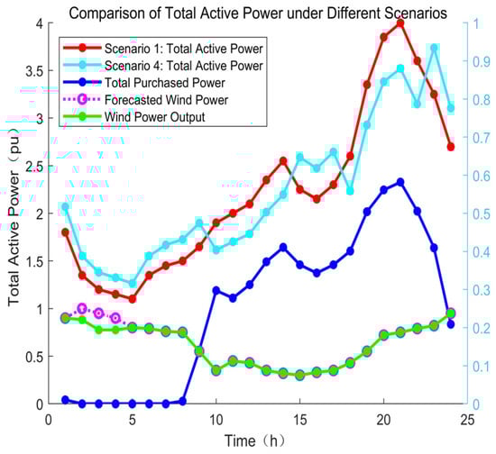 Figure 7 shows the basic situation of active loads for Scenario 1 (without considering the DR with EV cluster shared energy storage) and Scenario 4 (considering DR with EV cluster shared energy storage). And it is compared with the turbine output scenario. The processing and comparison of DG in Figure 5, Figure 6 and Figure 7 shows that the results of DG scenario generation can generate the randomness and correlation of the DG unit output in the selected area more accurately. The DG data, after the above data processing, facilitate the overall planning of the ADN system at the early stage of construction, which further improves the operational reliability and economy of the ADN system.