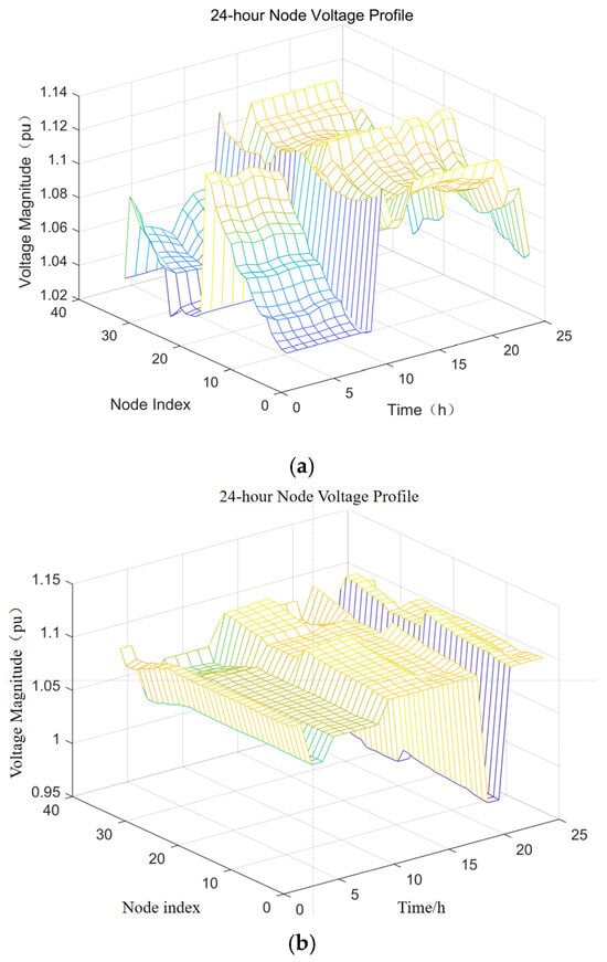 The node voltages of Scenario 1 and Scenario 4 are shown in Figure 8a,b. A comparative analysis of the node voltages of the two scenarios shows that the voltage stability of the ADN system in Scenario 4 is significantly improved by adding the DR, as well as the energy storage model with the EV cluster dispatchable potential. The degree of voltage offset of the system in Scenario 4 in the time period of 0:00–10:00 is significantly improved compared to Scenario 1. Taking node 7 as an example, the voltage deviation of node 7 in Scenario 4 is reduced by 25% compared to Scenario 1, which verifies the effectiveness of the proposed scheme.