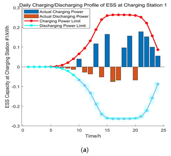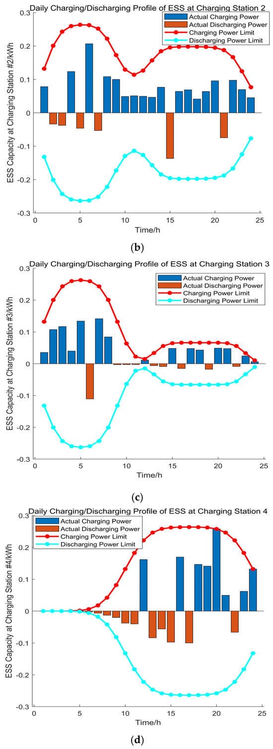In order to further analyze the role of EV cluster shared energy storage and to further analyze the impact of EV cluster shared energy storage on the node voltage and economy, this paper analyzes the charging and discharging power versus storage capacity curves of the EV cluster shared energy-storage device assembled at node 32 in Scenario 4. It is assumed that four different charging stations are put into operation at the same time, and each charging station has a different EV type, which is in line with the actual operation and scheduling situation. The specific analysis results of the EV cluster shared energy-storage charging stations are shown in Figure 10.