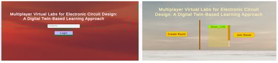 The implementation was carried out in the Unity engine (v2021.3.x LTS), using the Photon PUN 2 and Photon Voice packages, which support multi-user functionality, action synchronization, and voice communication. The application follows three distinct operating scenes, as shown in Figure 1 and Figure 2: (1) Login, where the user enters their name and connects to the network using the ConnectUsingSettings method; (2) Lobby, where they can create or join collaboration rooms; and (3) Game, where the main interactive circuit assembly experience takes place.