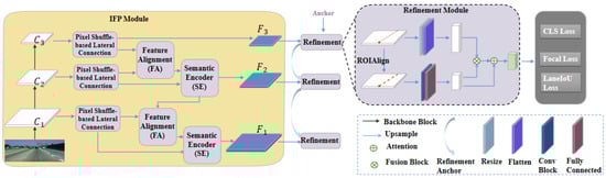 The cross-layer refinement (CLR) module takes the fused multi-scale feature map and produces the final lane detections. In reference to CLRNet [], a line-anchor approach is adopted: a lane line can be represented as a sequence of points along the y-axis, with the fixed pixel intervals for sampling the x-axis. Each anchor X is represented by a sequence of N points . These anchors are subsequently refined using a cross-layer refinement block. The refinement process uses the fused feature maps and anchors as input and applies ROIAlign [] to extract more precise local features.