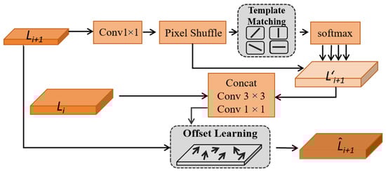 where is the ReLU activation function and denotes batch normalization. The learned offset is used to align each spatial location in the low-resolution feature map to the corresponding location in the high-resolution feature map. After template matching and offset learning, using the alignment function [], can be aligned with . The aligned feature of can be calculated as follows: