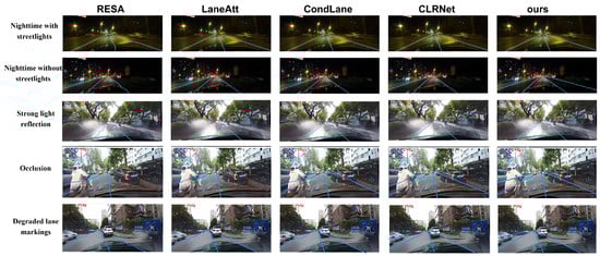 To evaluate the performance of our method, we present qualitative comparisons of different methods under five representative challenging scenarios in the CULane dataset, including nighttime with streetlights, nighttime without streetlights, strong light reflection, occlusion, and degraded lane markings. The visualization comparison results of our approach against four representative methods: RESA [], LaneATT [], CondLane [], and CLRNet [] are illustrated in Figure 4. It can be seen that the proposed method consistently outperforms the methods under these adverse conditions.