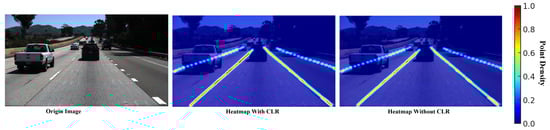 To further validate the effectiveness of the proposed cross-layer refinement (CLR) module, we conducted a heatmap-based visualization experiment to compare lane localization results with and without the CLR module. As shown in Figure 5, the original input image is presented alongside two corresponding heatmaps: one generated by the complete model incorporating CLR, and the other produced by the model without CLR. For both heatmaps, the four lanes with the highest confidence scores are selected as the output of lane detection. The point density of all predicted lane points from predefined anchors falling on these four lanes is aggregated and visualized as a heatmap, where regions in red correspond to areas with high point density. The heatmap with CLR demonstrates significantly sharper, more continuous, and denser activations along the lane regions, indicating improved spatial localization and enhanced semantic focus. In contrast, the model without CLR yields more diffuse and fragmented responses, reflecting weaker feature alignment and reduced localization accuracy. These visual comparisons further corroborate the CLR module’s contribution to refining feature representations and boosting detection robustness under complex visual conditions.
