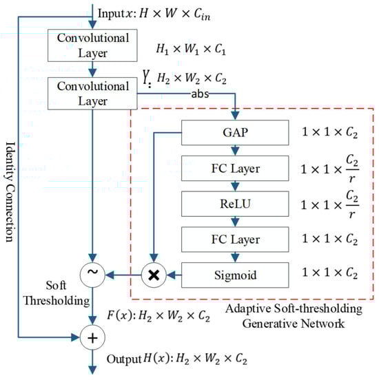 d. Soft-thresholding layer: The nonlinear transformation is performed as described in Equation (4). The output feature map Y from the residual block’s convolution layer is shrunk channel by channel according to the soft threshold to suppress the noise characteristics. This layer is the core step of the denoising process.