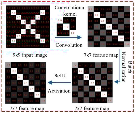 The basic residual block consists of two basic convolutional layers, each comprising a 3 × 3 convolution, batch normalization (BN) and the ReLU activation function. As illustrated in Figure 2, the convolution operation extracts local features by sliding the convolution kernel over the input data to generate feature map. Different convolution kernels can learn different features, such as contours, textures, etc. Batch normalization adjusts the feature map to a stable distribution with a mean of 0 and a standard deviation of 1 to accelerate training. The ReLU activation function introduces nonlinear operations, enabling the network to learn complex nonlinear mappings and thereby enhancing the model’s representational capacity.