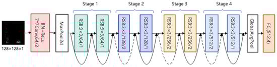 Based on the conventional ResNet18 architecture, its original residual modules are replaced with RSBs, and the network structure is adjusted to align with the input and output dimensions required for PRPD pattern recognition. The network structure for PRPD pattern recognition is constructed as shown in Figure 4, with detailed parameters listed in Table 1. The model contains 18 weighted operation layers. The initial convolution layer (Conv2d+BN+ReLU) employs a 7 × 7 receptive field to extract the foundational features from input PRPD images. Normalization and activation operations serve to stabilize training process and enhance nonlinear representation. The Max Pooling layer (MaxPool2d) then reduces the spatial dimensions of the feature map, thereby highlighting key information and decreasing subsequent computational overhead. The backbone network is organized into four residual shrinkage stages, each containing two modules in series, either standard or downsampling RSB. The soft threshold shrinkage mechanism is applied within these blocks to suppress noisy features, and the identity connection is used to residual learning to mitigate vanishing gradients in deep networks. By adjusting the stride and channel count, the feature map is spatially downsampled and channel-expanded, enabling the progressive extraction of higher-level features. At the classification layer, the Global Average Pooling (GlobalAvgPool) aggregates spatial information into channel-level features, thereby reducing parameters and mitigating overfitting. Finally, the FC layer maps these features to the class space and applies a Softmax activation function to generate class probabilities for the partial discharge recognition task.