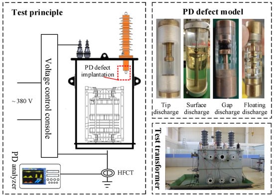 Acquiring and constructing a partial discharge (PD) dataset is a prerequisite for constructing a partial discharge recognition model. The experiment was carried out on a partial discharge test platform designed by Baoding Tianwei Xinyu Technology Development Co., Ltd. (Baoding, China), as shown in Figure 6. The experiment was conducted on an oil-immersed 35 kV transformer model TWTM-35, which is a three-phase, three-winding transformer with a rated frequency of 50 Hz and rated voltages of 35/0.4/0.4 kV. Four typical PD defect models were set up: tip discharge, surface discharge, air-gap discharge, and floating discharge. A TWHCT-8033K high-frequency current transformer (HFCT) was used to collect partial discharge signals from the neutral grounding wire of the transformer winding. The signals were detected by a TWPD-2F comprehensive partial discharge analyzer, with a sampling rate of 20 MS/s, a bandwidth range of 10 kHz to 20 MHz, and a measurement range of 0.1 pC to 10,000 pC.