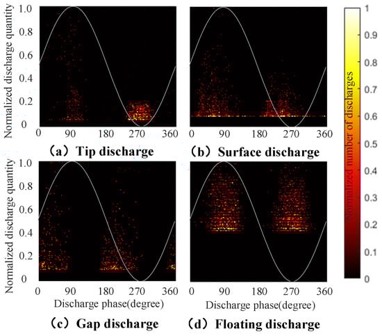 Figure 7 shows the collected PRPD examples for four types of partial discharge. The horizontal axis of the image represents the discharge phase (0~360°), the vertical axis shows the normalized discharge quantity, and the values in the matrix indicate the number of partial discharges at the corresponding phase and quantity bins.