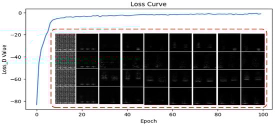The original PRPD dataset was expanded using the Wasserstein GAN with Gradient Penalty (WGAN-GP). As shown in Figure 8, the adversarial loss function of the generator exhibits a stable convergence trend during the training process. With an increasing number of iterations, the generator gradually captures the implicit distribution characteristics of the discharge pulses. Consequently, the distribution features in the generated samples become more pronounced, and the clarity of the spectral textures is progressively refined. After 100 epochs, the loss value stabilizes, indicating the completion of the training process. The number of PRPD samples for each type of discharge defect was augmented to 800, resulting in an enhanced and balanced dataset.