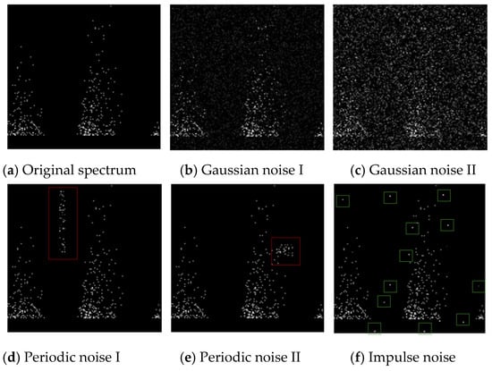 In practical engineering, transformers operate within complex electromagnetic environments characterized by significant noise interference. To improve the generalization ability of the model, it is necessary to introduce artificial noise into the PRPD experimental dataset. During the partial discharge detection of substation transformer, the PRPD images is susceptible to three typical types of electromagnetic interference, including random white noise arising from the inherent characteristics of the circuit, periodic noise caused by power frequency and harmonic interference, and impulse noise from switch operation or electromagnetic wave signal. This paper injects these above noise types into the sample set to simulate the impact of actual electromagnetic interference on the spectrum, thereby enhancing the robustness of the model and better adapting to practical applications. Examples of the injected noise spectrum are shown in Figure 9, and the resulting datasets are shown in Table 2.