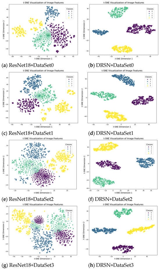The feature visualization results for the noisy datasets (DataSet2 and DataSet3), demonstrate that the features extracted by the DRSN model still show excellent intra-class compactness and inter-class separation. This indicates that the model’s feature extraction is robust to noise and maintains good representation capabilities for noise data; in contrast, the ResNet18 model’s feature extraction under noisy conditions results in significantly reduced inter-class separation and blurred class boundaries, particularly in mixed noise datasets, leading to substantial inter-class confusion and an increased risk of misclassification.