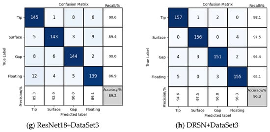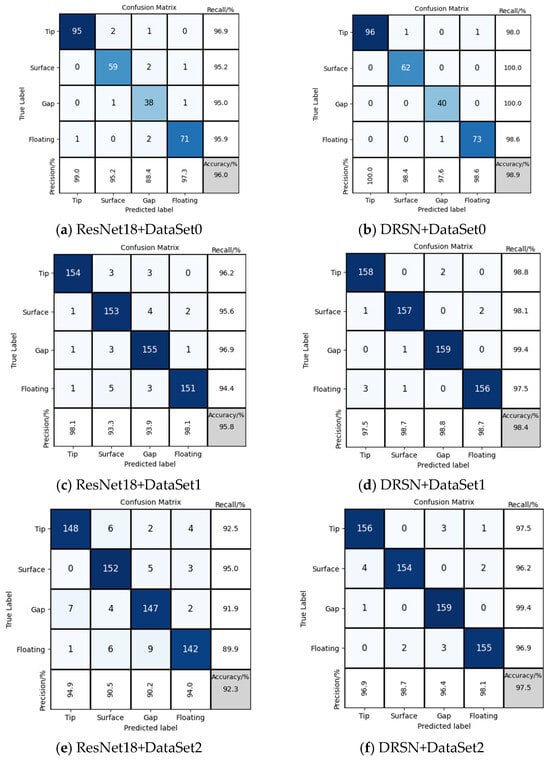 The proposed DRSN model and the conventional CNN models are applied to the discharge pattern recognition task on both the original dataset and the noisy datasets. Figure 11 shows the confusion matrices for the ResNet18 model and DRSN model on the test dataset. In each matrix, the horizontal axis denotes the true labels of each discharge type, while the vertical axis represents the recognition result by the model. The values in the matrix represent the number of samples classified into each class by the model, with the diagonal values indicating correctly recognized samples and the off-diagonal values representing misclassified samples.
