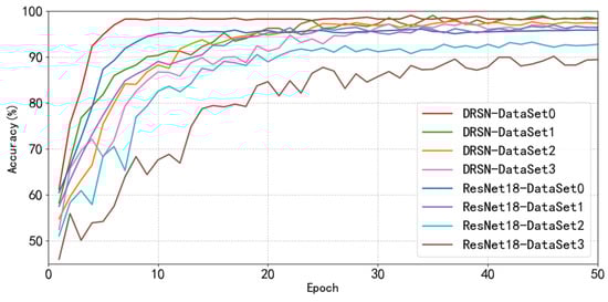 To further evaluate the model’s performance under different noise interference, Figure 12 shows the test accuracy curves of the DRSN model and the ResNet18 model across the training epochs on four PRPD pattern datasets.