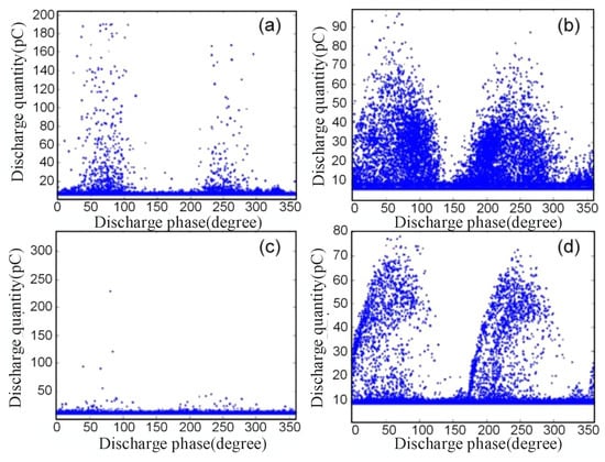 For tip discharge defects, the discharge pulse phases are mainly distributed near the applied voltage peak, and the discharge signal displays a polarity effect. Surface discharges mainly occur near the rising edge and peak values of both the positive and negative half cycles, with a wide phase distribution and a less obvious polarity effect. Air gap discharges primarily occur within the phase ranges of 0–90° and 180–270°, with positive and negative half cycles showing similar discharge amplitudes and counts. The floating discharge phases are mainly distributed on both sides of the applied voltage peak, exhibiting some symmetry between positive and negative half-cycles, with a relatively strip-shaped distribution area.