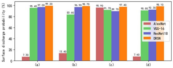The above PRPD images are preprocessed and converted into 128 × 128 gray-scale images. Subsequently, both the proposed DRSN model and conventional CNN models are employed for pattern recognition. Figure 14 shows the probabilities of each model identifying the PRPD images as surface discharge.