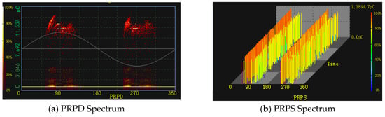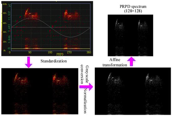 Figure 15 shows the PRPD and PRPS images collected from an operational transformer using a partial discharge comprehensive analyzer. The type of transformer discharge has been confirmed as floating discharge. Preprocess the PRPD image and convert it into a standardized 128 × 128 grayscale image. The image processing process is shown in Figure 16.