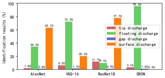 The DRSN recognition model and conventional CNN models are used to identify the discharge type of the image, with the recognition results presented in Figure 17.