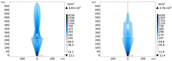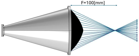 The simulated focal length was measured by finding peak power density location along the axis in Figure 6. It was found to be mm from the antenna outlet, in good agreement with the designed value of 100 mm. This small discrepancy (around 0.5%) is within expected limits, considering inherent discretization in numerical simulations and approximations in lens design equations (Section 2.2).