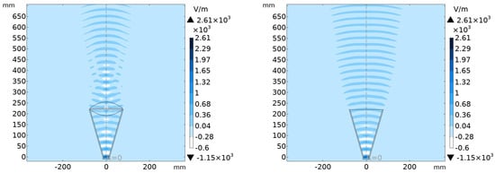 Figure 4 presents simulated electric field magnitude distribution in the -plane for both configurations. Figure 4 Right shows the expected divergent pattern for the horn antenna without lens, where field strength diminishes with increasing distance from the aperture. In contrast, Figure 4 Left demonstrates the focusing effect when the dielectric lens is introduced. Field lines converge towards the designed focal point, situated approximately 100 mm from the lens surface, with peak field strength notably higher compared to the lens-free setup at the same location.
