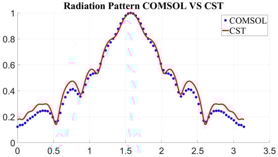 Cross-validation of our computational approach is demonstrated in Figure 5, comparing far-field radiation patterns from COMSOL Multiphysics and CST Studio Suite for the horn antenna without lens. Excellent agreement between simulation tools validates our computational methodology and confirms reliability of subsequent results. Both simulations show the expected symmetrical main beam with moderate directivity and characteristic side lobes.