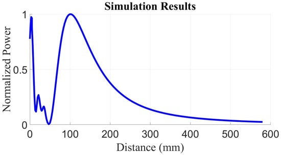 Integration of the dielectric lens achieved RF energy focusing consistent with design goals. Comparison between simulated and measured normalized power density along the propagation axis (Figure 17) shows good focal length agreement. The measured focal point around mm aligns well with the simulated prediction of mm, supporting the validity of the lens design methodology and simulation model.