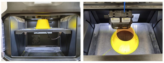 The horn antenna was fabricated using 3D printing with Acrylonitrile Butadiene Styrene (ABS) filament to achieve adequate mechanical strength and temperature resistance. The printing process (illustrated in Figure 8) used a Qidi i Fast 3D printer (Qidi Technology, Zhejiang, China) utilizing Fused Deposition Modeling (FDM) technology, where ABS filament is melted and extruded layer by layer. Printing parameters including layer height, infill density, and printing speed were optimized to balance printing time and structural integrity.