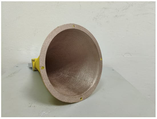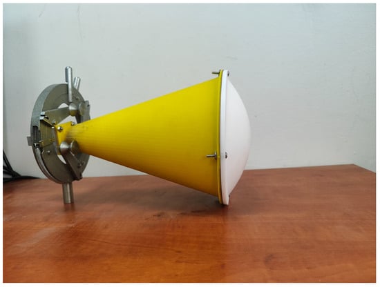 Integration of the dielectric lens with the horn antenna was achieved through a mechanical interlocking mechanism designed directly into the 3D-printed antenna structure and machined lens. The antenna design incorporated precisely located grooves and holes corresponding to matching features on the lens. The lens featured holes aligned with those on the antenna, allowing secure fastening using screws. This method ensured stable and repeatable alignment between antenna and lens, crucial for maintaining desired focusing characteristics. Figure 12 depicts the final assembled prototype.