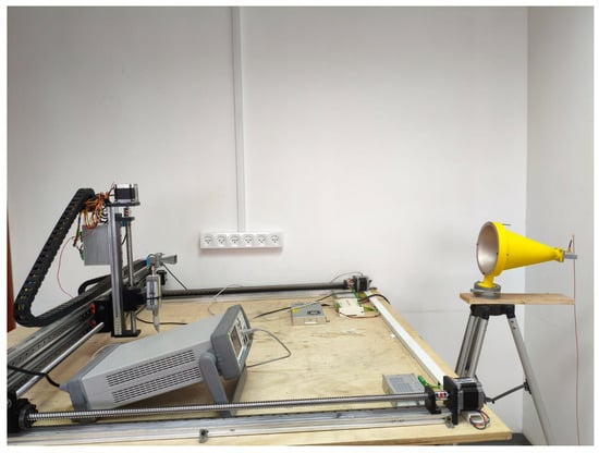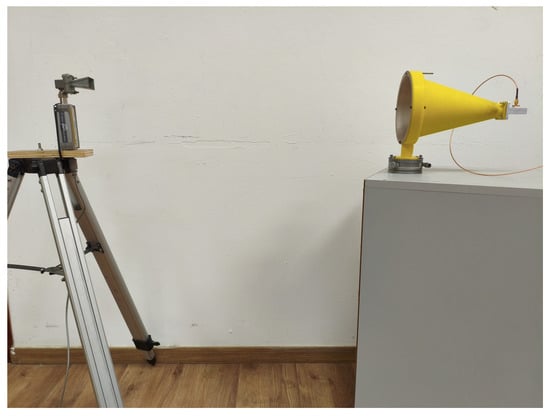 The receiving horn antenna was mounted on the optical actuator at a fixed distance of 2.5 m from the transmitting antenna. This distance satisfies the far-field criterion , where D is antenna aperture diameter and is wavelength. For our system with mm and mm at 10 GHz, the minimum far-field distance is: