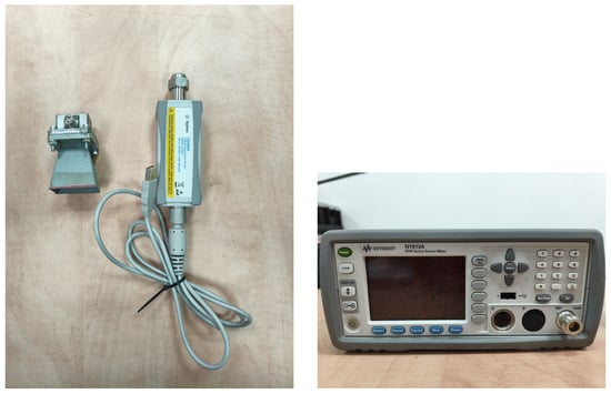 The receiving antenna, identical to the transmitting one, was mounted on a precision XYZ motorized positioning system (model XYZ Linear Stage) with 5 mm resolution incremental movements. The receiving antenna was aligned coaxially with the transmitting antenna and moved along the propagation axis (z-axis) to measure received power versus distance. Power levels were recorded using a calibrated power meter (Keysight N1914A, Keysight Technologies, Santa Rosa, CA, USA) connected directly to the receiving antenna through low-loss coaxial cable. Measurements were conducted in 5 mm incremental steps, covering a range sufficient to capture power density variation near the designed focal point (approximately 100 mm). Figure 13 shows the overall setup.