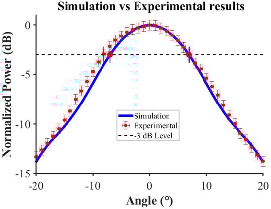The far-field radiation pattern of the fabricated horn antenna without dielectric lens was measured to characterize baseline performance and compare with the simulation model. Figure 16 presents the comparison between measured normalized power (in dB) versus angle and corresponding COMSOL simulation result.