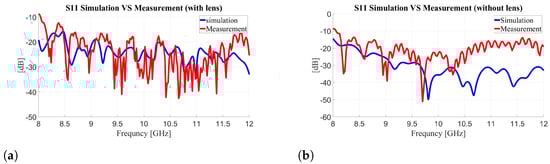 S11 performance comparison between simulation and measurement results: (a) complete antenna–lens system, and (b) horn antenna without dielectric lens. Both configurations demonstrate S11 values better than dB across the frequency range, with good agreement between simulation and experimental results.