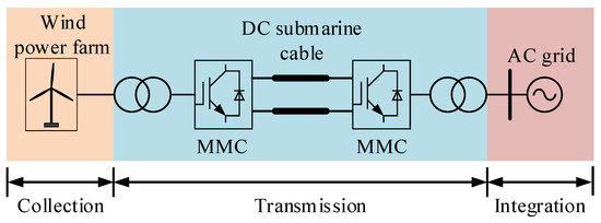 The overall configuration of an OWP grid integration system via VSC-HVDC is illustrated in Figure 1, comprising three core components: wind power collection, VSC-HVDC transmission, and onshore grid integration.