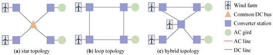 Schematic diagram of offshore wind power integration via VSC-HVDC transmission system. (a) represents the star topology; (b) represents the loop topology; (c) represents the hybrid topology of star and loop.