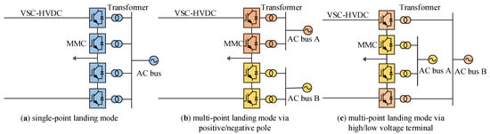 Landing modes of VSC-HVDC receiving terminals. (a) represents the single-point landing mode; (b) represents the multi-point landing mode via positive/negative pole; (c) represents the multi-point landing mode via high/low voltage terminal.