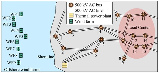 This section presents a case study of a specific regional power grid. In this scenario, nine OWFs with a total installed capacity of 5600 MW require centralized transmission. The onshore AC grid load center is situated 220 km inland from the shoreline. Table 4 lists the installed capacity of each wind farm, and Figure 4 depicts the geographic layout of the OWFs and the AC grid connection configuration. Specifically, the load center area features 3876 MW of local power generation, 17,406 MW of active load demand, 13,530 MW of power imported from external regions, and a system-wide maximum tolerable power loss Pmax-fail = 4200 MW.