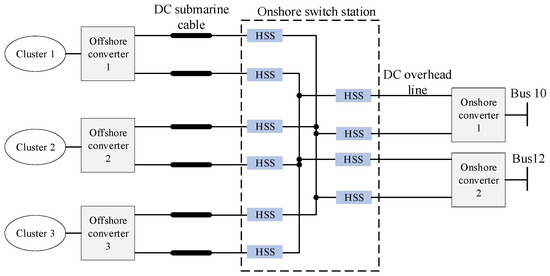 Given the DC system’s configuration, which includes three offshore terminals, two onshore terminals, and all converter station capacities below the AC grid’s Pmax-fail = 4200 MW, a star topology is selected for the DC network. The designed multi-terminal DC system is depicted in Figure 5, where HSSdenotes the high-speed switch of the DC line. Offshore wind farms are aggregated via three DC submarine cables to an onshore switch station, which converts the power to two DC overhead lines for transmission to the load center. These lines terminate at Bus 10 and Bus 12, respectively, forming a classic star structure: all converter stations connect to the common DC bus through individual feeders, ensuring compliance with the AC grid’s fault tolerance requirements. This topology efficiently balances cost-effectiveness and operational reliability, with each terminal’s capacity within the grid’s tolerable power loss threshold.
