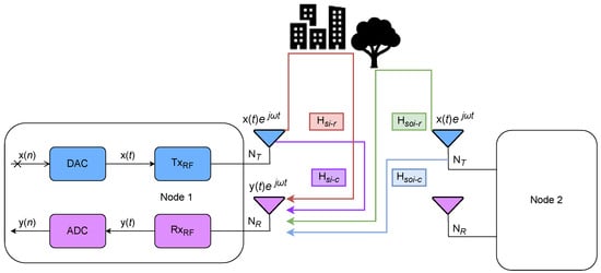 Here, is the additive Gaussian noise. For each node at time k, and are the direct SI and SOI channels, respectively; and denote the reflected channels at the i-th transmit antenna; and and are the SI and SOI signals from the i-th transmit antenna, respectively. Each channel, now explicitly represented as a function of time k, is assumed to have independent, identically distributed (i.i.d.) entries for a given time instant. For convenience, we can rewrite the equation in matrix form at time k as follows: