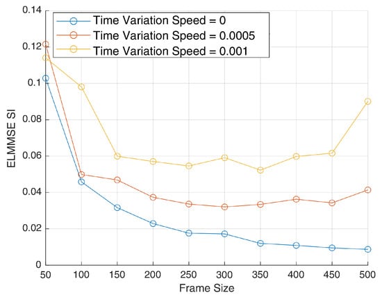 Figure 2 shows the evolution of the ELMMSE for the SI reflection channel across varying frame sizes. In the static case (i.e., ), the estimation error decreases steadily with increasing frame length, reaching approximately 0.01 at 500 symbols. This improvement occurs because longer frames provide more statistical information for the ICA algorithm to exploit. However, for time-varying channels, the behavior is noticeably different. The slowly varying case () shows optimal performance around 200–250 frames, after which the error begins to increase. The moderately varying case () exhibits even more pronounced degradation, with optimal performance occurring around 150 frames. This degradation occurs because the average composite mixing matrix becomes less representative of any individual time frame as the channel varies more significantly over the processing block.
