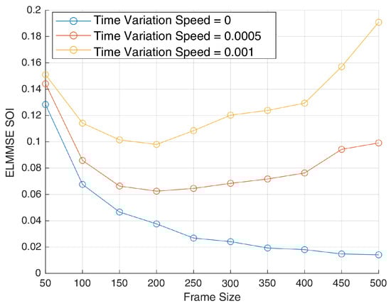 A similar trend is observed in Figure 3, which shows the ELMMSE for the SOI channel . The estimation error decreases rapidly for small-to-moderate frame sizes across all variation speeds but begins to degrade when the channel varies too quickly within a block. In particular, the curve for demonstrates increasing error beyond 200–250 frames, highlighting the fundamental limitation of using batch ICA methods in dynamic environments. The SOI channel estimation appears more sensitive to time variations than the SI channel, likely due to the lack of prior knowledge about the SOI signal structure.