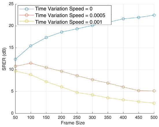 Figure 4 displays the SRER in decibels, which quantifies the quality of the recovered communication signal. The static case () shows a consistent increase in SRER with frame size, reaching over 22 dB by 500 symbols. However, in time-varying scenarios, performance peaks early and then degrades significantly. For , the SRER begins to decline beyond 200 frames, while for , the degradation starts even earlier (around 150 frames) and is more severe, dropping below 4 dB. These results show that while longer frames improve statistical estimation in principle, they also introduce greater inconsistency between the assumed and actual mixing behavior, leading to poorer separation outcomes in dynamic channels.