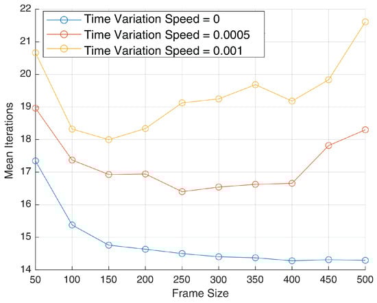 Figure 5 depicts the average number of iterations required by the FastICA algorithm to converge. In the static case, iteration count decreases from about 15 at small frame sizes to approximately 14 at larger frame sizes, indicating improved convergence efficiency with more data. However, for time-varying cases, convergence behavior is different. The slowly varying case () maintains relatively stable iteration counts around 17–18. The moderately varying case shows the most challenging convergence behavior, requiring over 21 iterations at 500 symbols. The increased convergence time reflects the algorithm’s difficulty in finding a consistent separation solution when the underlying mixing matrix is changing during the processing block.