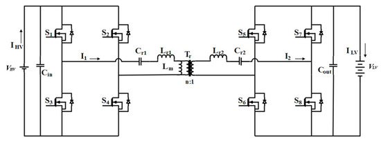 Figure 2 illustrates the configuration of the CLLC converter. In Figure 2, and denote the voltage and current at the high voltage side, respectively; denotes the primary current; denote the primary switches; denote the secondary switches; and denote the resonant capacitors; and denote the resonant inductors; denotes the magnetizing inductor; denotes the secondary current; and denote the input and output capacitors, respectively; and denotes the voltage at the low voltage side.
